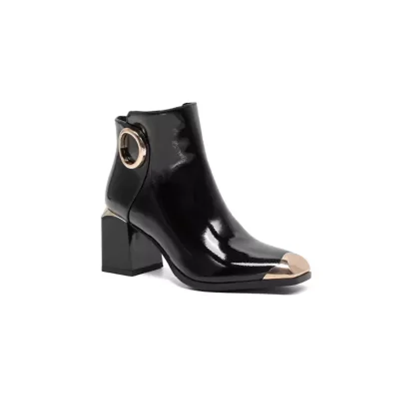Make a striking statement with these sleek patent ankle boots. A distinctive oversized ring embellishment adorns the side, adding a modern touch. The chic square toe features a bold metallic cap detail. These boots are finished with a stylish block heel with metal trim, making them a true fashion standout. Zip closure CHINA Imported Product Specifications 2.75" M Material Faux Leather