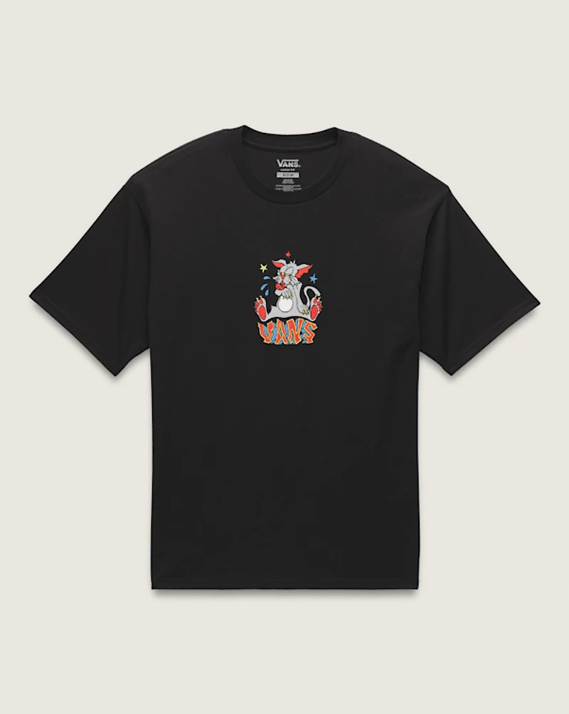 Tone it down in the Frizz T-Shirt, a loose fit short sleeve crew neck T-shirt with a screenprinted graphic of a spaced out cat sitting atop the Vans® logo.
