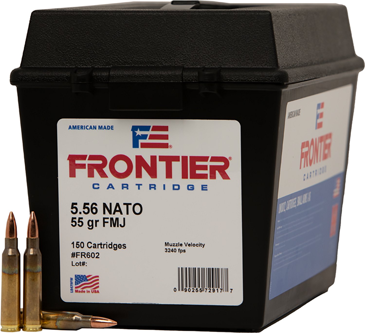 Head into the field with Frontier 5.56 NATO 55gr FMJ Ammo Can 150 Round. The 5.56 NATO caliber rounds have a 55 grain weight, and the ammo can contains 150 rounds.