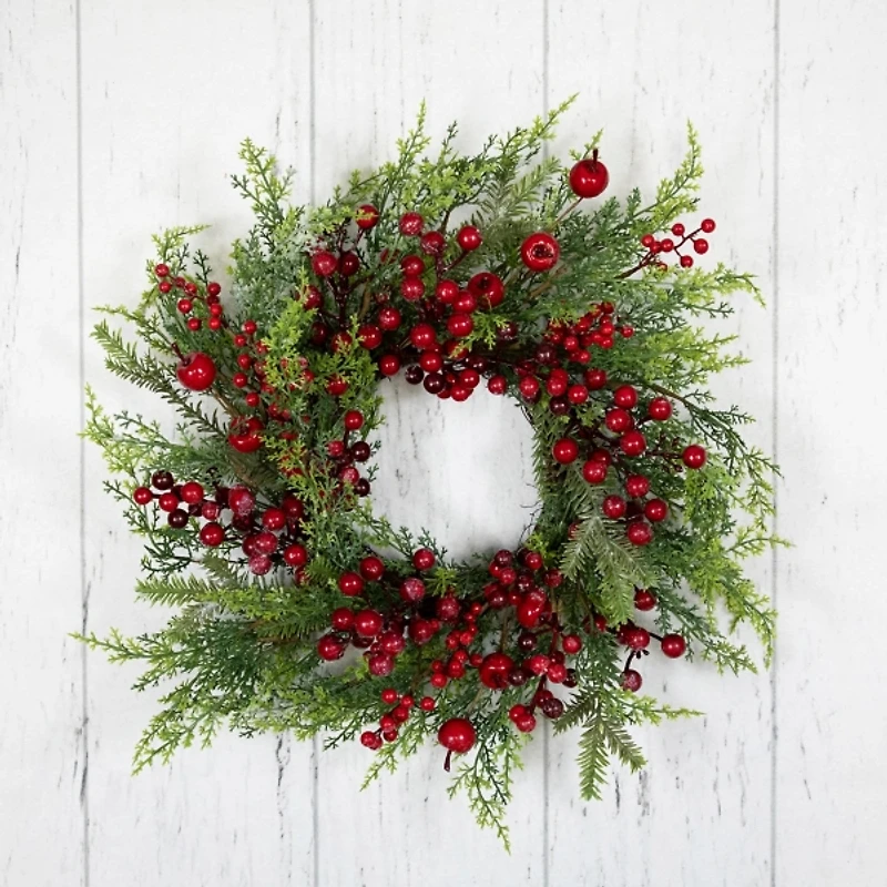 Add a touch of festive cheer to your door or mantel with this Frosted Berry and Crabapple Cedar and Pine Wreath! You'll love how the icy details on the berries and apples make this wreath perfect for the whole winter season! Wreath measures 24 in. in diameter Crafted of artificial materials Artificial cedar, pine, crabapple, and berry mix Hues of green and red Features a grapevine ring backer for hanging Safe for covered outdoor use Care: Dust with a soft, dry cloth. This item is available at Kirklands.com only, not available in stores. Please note: this item cannot be shipped to APO/FPO addresses.