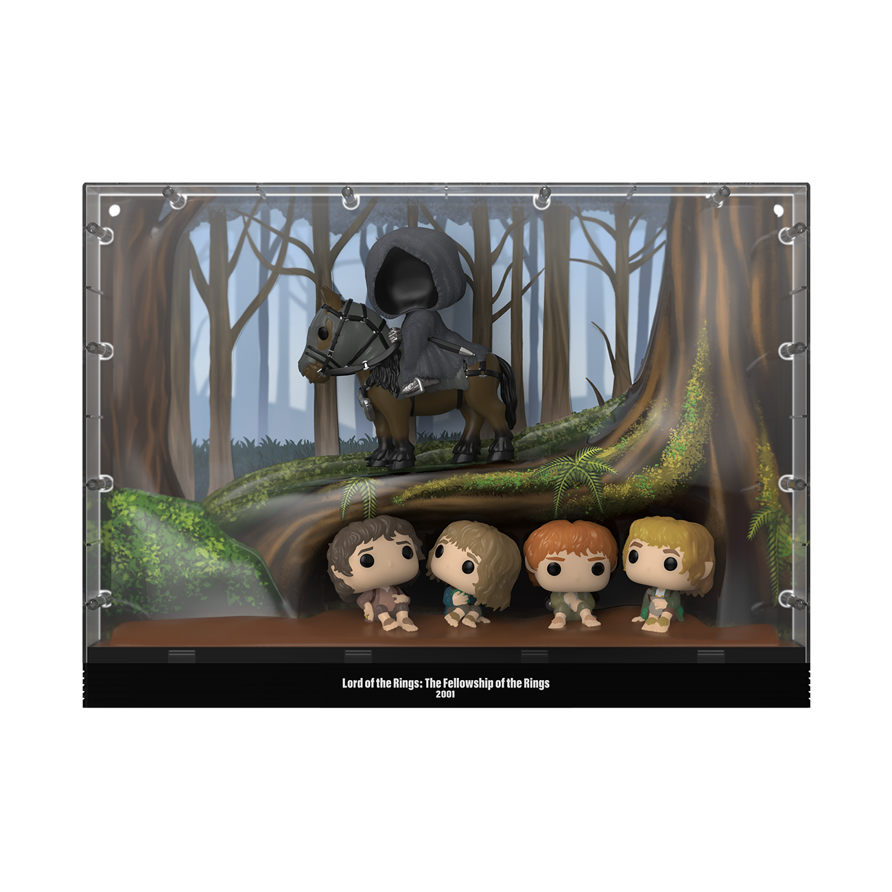 A dark force is on the hunt for the One Ring™! Pop! Frodo™, Pop! Pippin™, Pop! Samwise™, and Pop! Merry™ have gotten off the road just in time to hide beneath the roots of a tree from the searching gaze of the Nazgul™. Help these Hobbits™ evade the Ringwraith™ by giving them shelter in your The Lord of the Rings: The Fellowship of the Ring™ collection as this Deluxe Pop! Moment! Pop! figures are adhered to backdrop to ensure scene integrity and ease of display. Approximate dimensions of protective case: 18”W x 13.25”H x 4.75”D