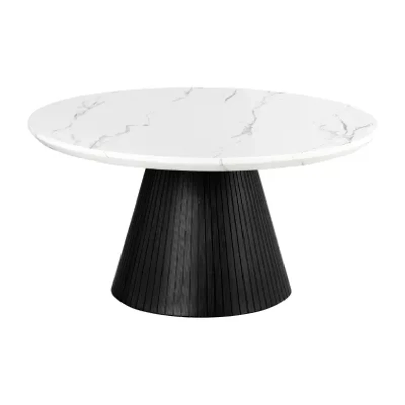 Perfect for contemporary living rooms, lounge areas, or stylish office spaces, this coffee table adds an elegant touch with its high-gloss faux marble top and refined aesthetics. The curved edges soften its bold design, making it a sophisticated centerpiece for gatherings, coffee breaks, or displaying d�cor. The striking black pedestal base with fluted detailing creates a strong visual contrast, ensuring this table stands out in modern interiors.