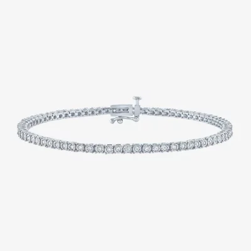 Elevate your outfit with this stunning tennis bracelet featuring 76 round-cut, Lab Grown white diamonds in a nick setting. Available in gleaming sterling silver and 14K yellow gold over silver, it is secured with a sturdy box clasp.