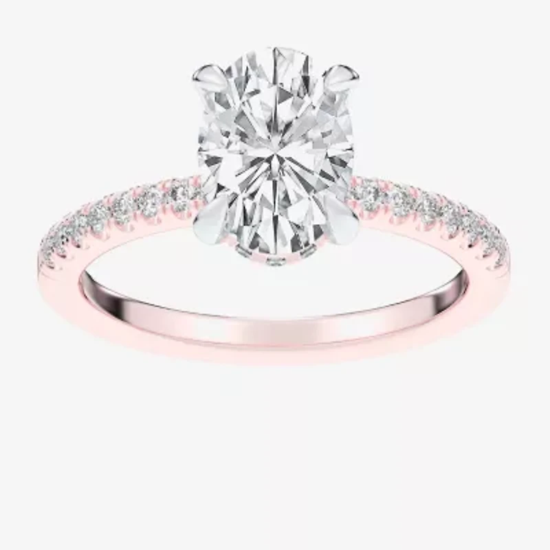 This women's engagement ring has a sparkling classic beauty that you'll love wearing to celebrate your forever after. This hidden halo ring features a 2 carat oval-cut Lab-Grown Diamond center stone and smaller round-cut stones on the sides set in 14K White Gold.