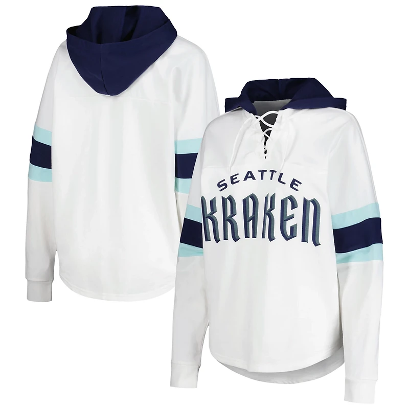 The Women's G-III 4Her by Carl Banks White/Deep Sea Blue Seattle Kraken Goal Zone Long Sleeve Lace-Up Hoodie T-Shirt is the perfect way to show your support for the Seattle Kraken With its contrast-color insets sewn-on stripes and lace-up V-neck design this hoodie is sure to turn heads The dolman sleeves and rounded droptail hem provide a comfortable and stylish fit while the screen print graphics proudly display your Seattle Kraken pride Made from a soft cotton and polyester blend this hoodie is perfect for any occasion whether you're cheering on the Kraken at the rink or just relaxing at home