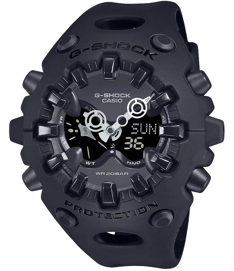 From G-Shock, this men's watch features: Resin case and strap Colored dial World time Multi-alarm Stopwatch Full auto-calendar Direct start Hand shift feature Buckle closure Strap length approx. 145mm - 215mm Case size approx. 49.1mm x 58.2mm x 19.6mm Water resistance: 200 meters Imported.