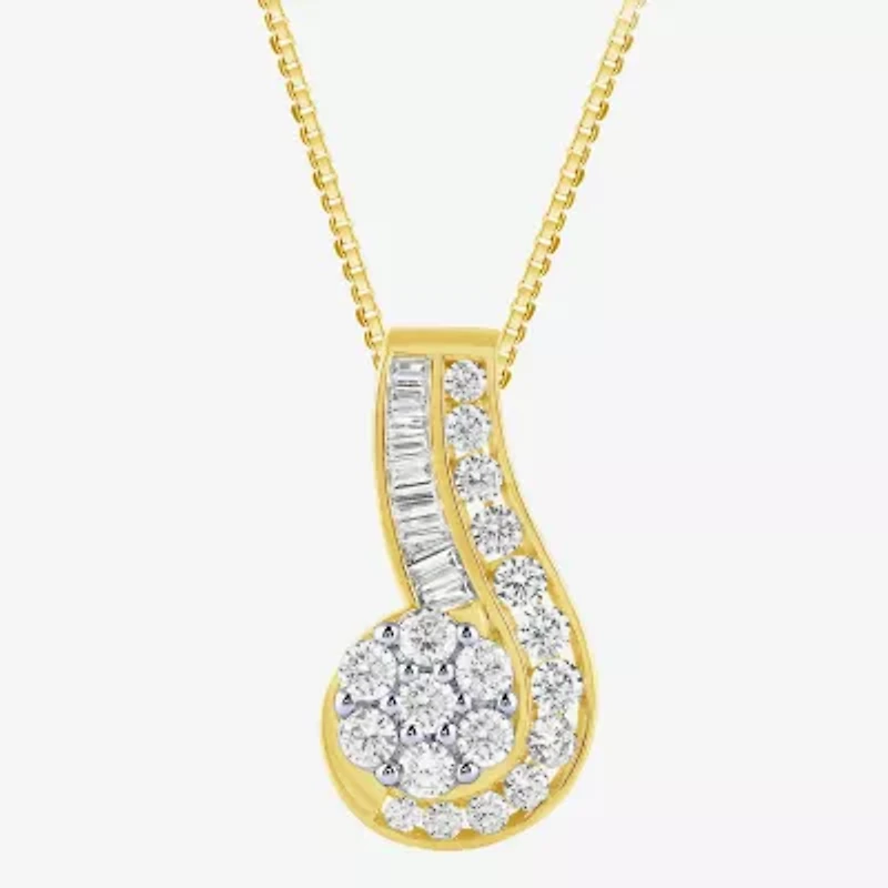 This women's pendant necklace from the Diamond Blossom collection adds an elegant feel to any ensemble thanks to its unique design showcasing a dazzling central floral-shaped cluster of round-cut Lab Grown Diamonds surrounded by a cascade of baguette and round-cut accents. It's crafted from 10K Yellow Gold and features a 2 carat total weight and a coordinating box chain with a spring ring clasp.