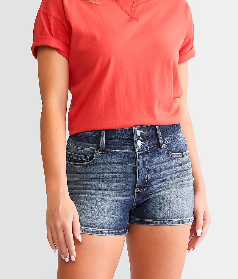 High rise Curvy fit, slightly eased through the hip and thigh 3" shortie short Comfort waistband Destruction details