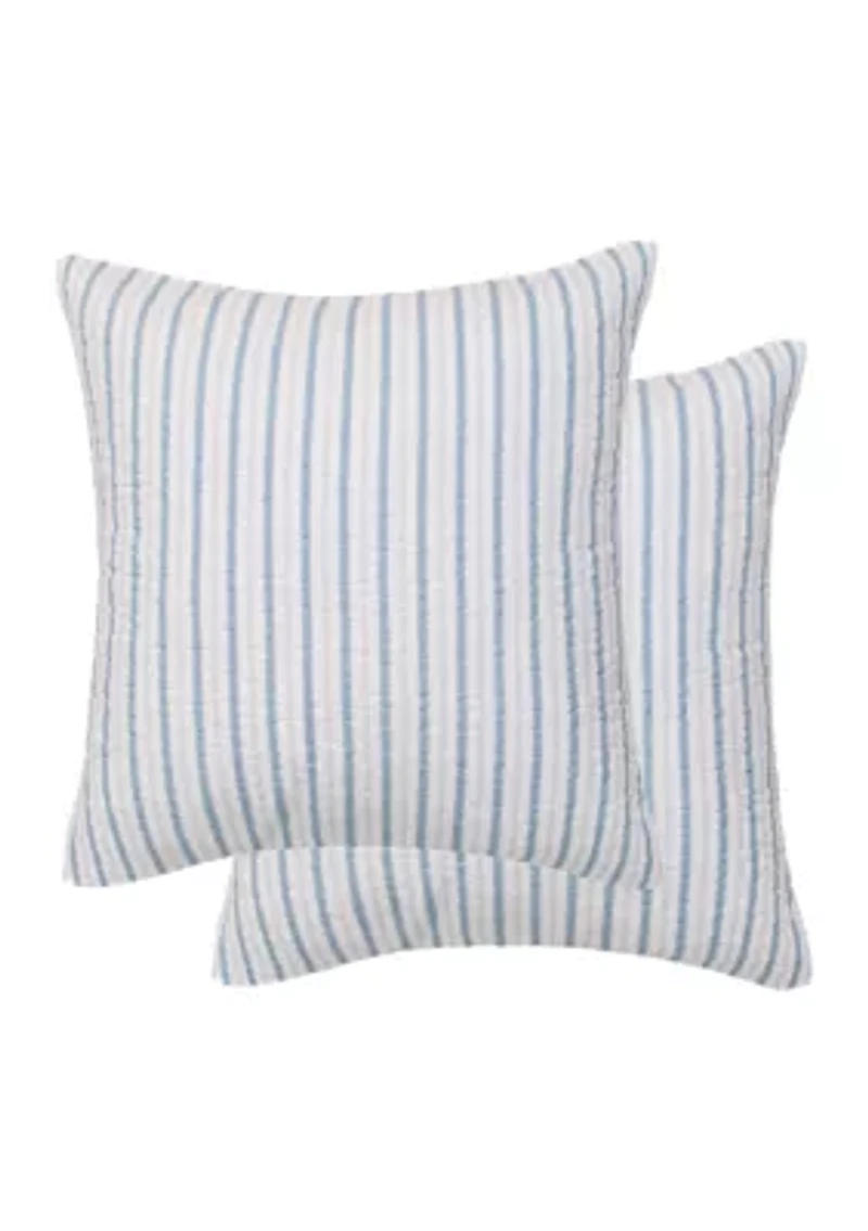 The Galapagos Euro Shams Set of Two (26-inch by 26-inch) by Levtex Home features a simple but classic stripe pattern in a blue and white pattern. These machine-washable Euro shams come unfilled and as a set of two. Set of 2 Imported Product Specifications 26 in x 26 in Material & Care Cotton Machine washable