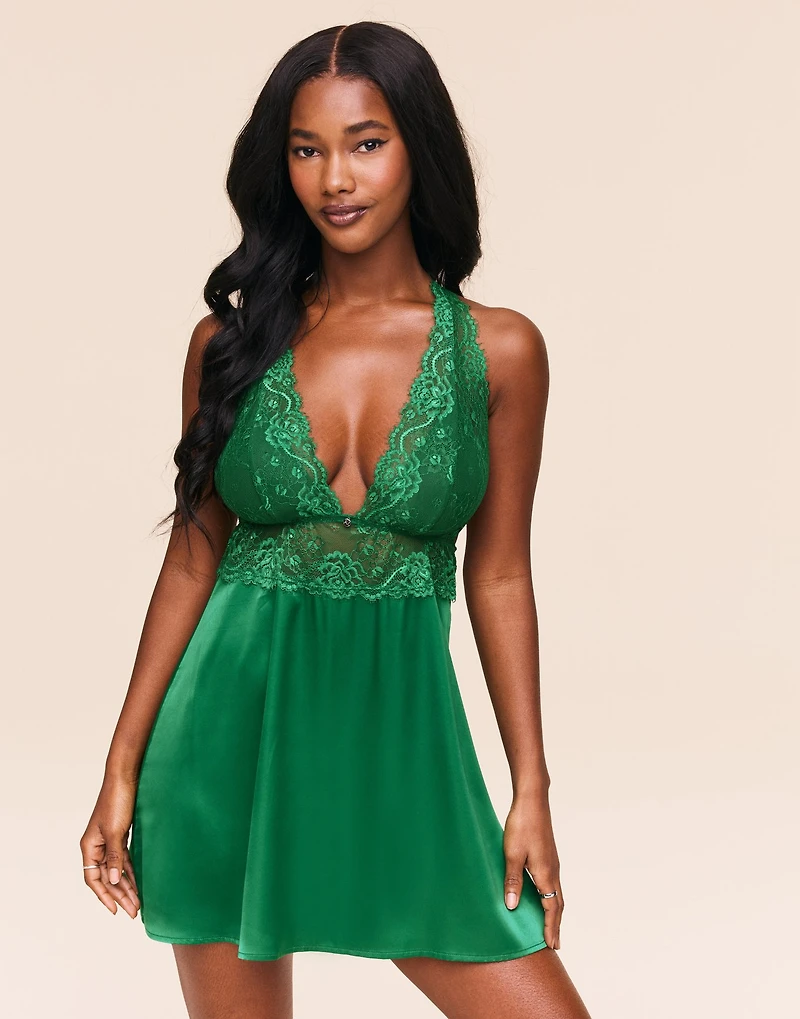 The Galilea Dark Green slip is a romantic-essentials piece made of satin. It features lace cups, a satin skirt, and racerback straps. (Available in sizes XS-4X)