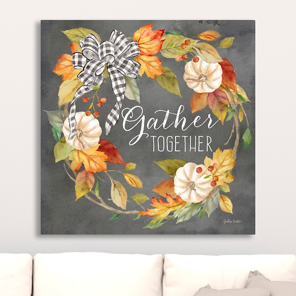 Bring the beauty of the changing season into your home with our Gather Together Black Wreath Canvas Art Print! You'll love how the warm orange tones standout against the black background. Art measures 30L x 1W x 30H in. Distinctively printed on stretched canvas Wrapped edges complete the look Features a fall wreath Accented with the phrase "gather together" in white lettering Hues of black, white, orange, green, yellow, and brown Weight: 2.5 lbs. Comes ready for wall mount; no additional hanging hardware required Care: Dust with a soft, dry cloth. This item is available at Kirklands.com only, not available in stores. Please note: this item cannot be shipped to APO/FPO addresses.
