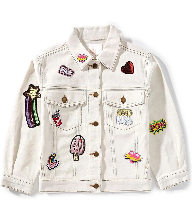 From GB Girls, this jacket features: Denim/jean jacket Long sleeves Mid weight Multi Patches 98% cotton and 2% spandex Machine wash/tumble dry Imported.