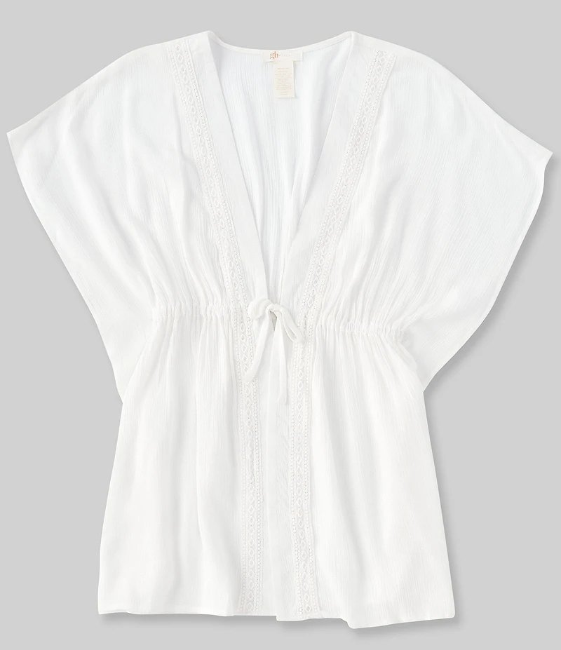 From GB Girls, this cover up features: Solid woven fabrication Open v-neckline Short kimono style sleeve openings Oversized, poncho silhouette Pullover construction Tie-front detail Novelty trim along front Rayon Machine wash/ tumble dry Imported.