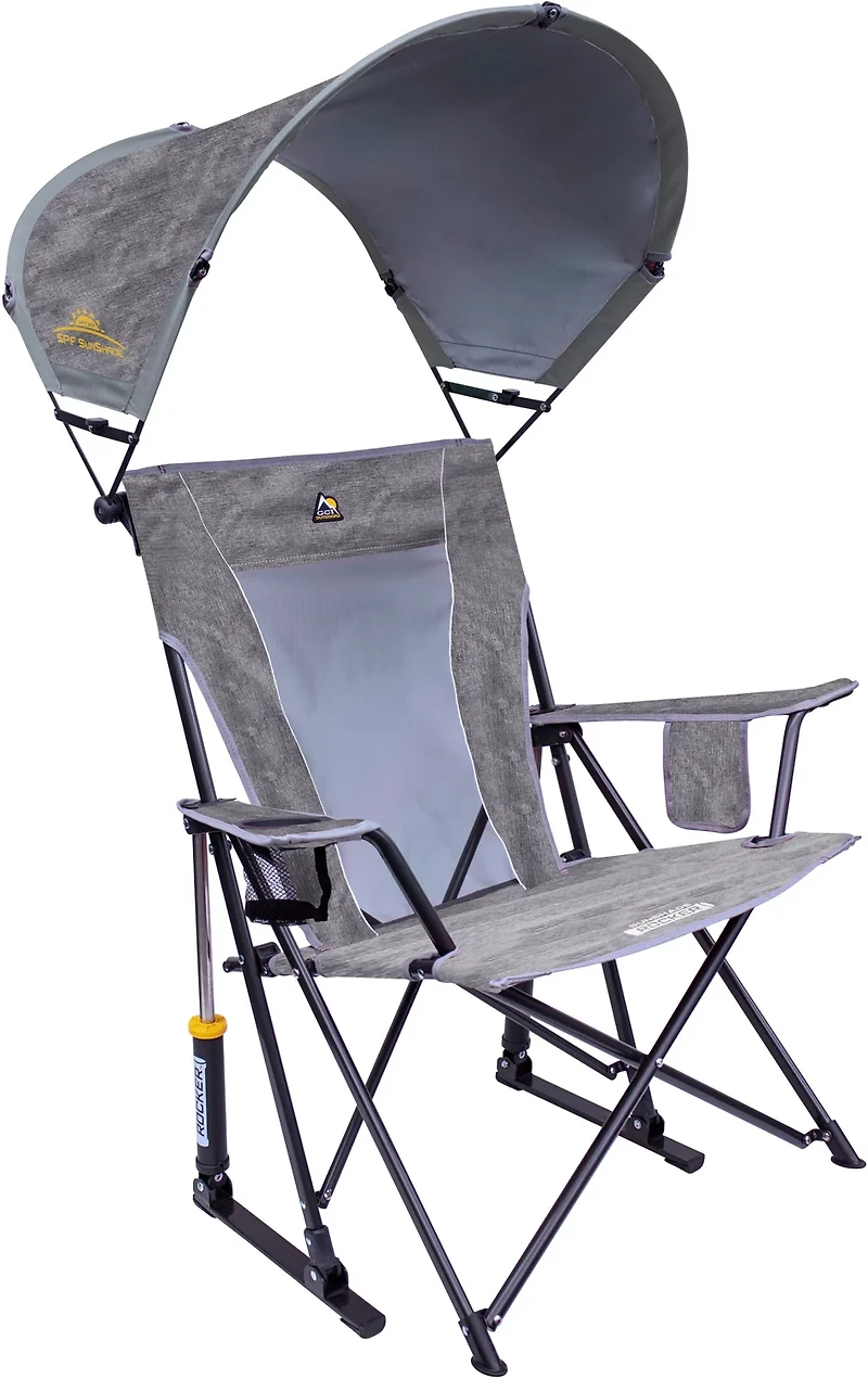Kick back and relax in the GCI Outdoor SunShade Rocker Chair. The built-in, fully collapsible SPF SunShade™ keeps you cool and shaded, and the Spring Action Rocking Technology delivers a smooth, calming rock. The built-in phone pocket and beverage holder offer added functionality, and the Large Mouth Bag™ with carrying strap makes it easy to bring this chair wherever you go.