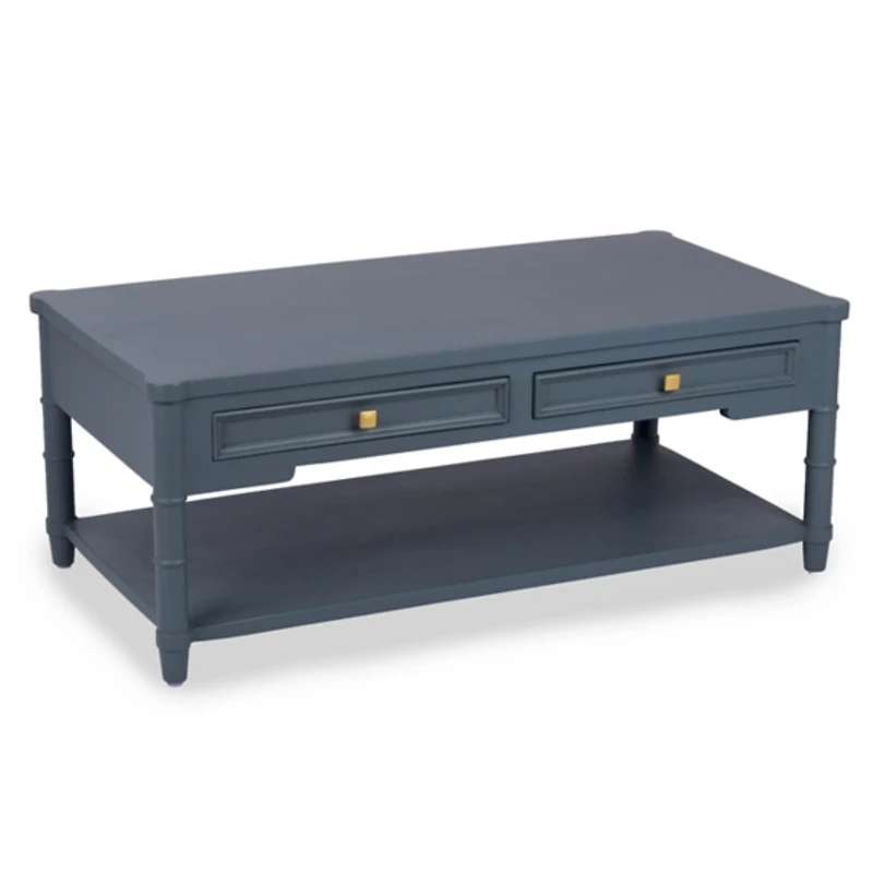 From modern farmhouse to classic coastal homes, this Genevieve French Blue Wood Coffee Table complements a variety of living room styles. Unique details include subtly carved legs and rounded tabletop corners for a charming touch. Plus, 2 drawers and a bottom shelf offer extra storage space for added functionality. Overall dimensions Width: 47 in. Depth: 23 in. Height: 17 in. Crafted of mango wood French blue finish Antique gold drawer knob Features two (2) drawers and a bottom shelf Carved legs Rounded tabletop corners Rectangular shape Weight: 63.1 lbs. Weight capacity: 250 lbs. Not intended for commercial use Care: Dust with a soft, dry cloth. Contact your local Kirkland's store for availability. Quantities and selection may vary by location. WARNING: Cancer and Reproductive Harm - For more information go to www.P65Warnings.ca.gov .
