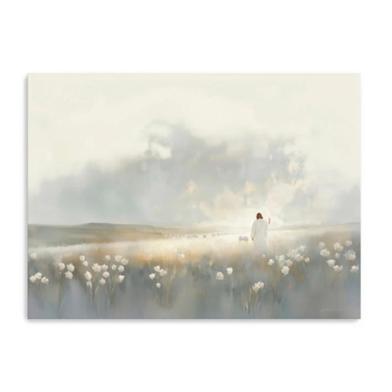 Enhance your living room wall with the lovely Gently Calling Canvas Art Print. With a serene, spiritual look, it's sure to create a calm atmosphere in your home. You'll love its graceful depiction above your mantle! Overall dimensions Width: 40 in. Depth: 1.25 in. Height: 30 in. Distinctively printed on stretched canvas Wrapped edges complete the look Features Jesus walking in a meadow Hues of ivory, gray, gold, and white Artist: Jay Ward Weight: 8.51 lbs. Hangs from back-mounted hardware Care: Dust with a soft, dry cloth. This item is available at Kirklands.com only, not available in stores. Please note: this item cannot be shipped to APO/FPO addresses.