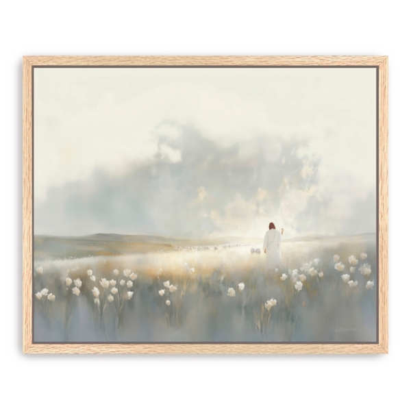 Let the graceful depiction of the Gently Calling Framed Canvas Art Print wash away your worries. You'll love the spiritual touch this beautiful image will add to your wall space! Overall dimensions Width: 32 in. Depth: 1.75 in. Height: 26 in. Distinctively printed on stretched canvas Natural frame around wrapped canvas Features Jesus walking in a meadow Hues of ivory, gray, gold, and white Weight: 13.3 lbs. Hangs from back-mounted hardware Care: Dust with a soft, dry cloth. This item is available at Kirklands.com only, not available in stores. Please note: this item cannot be shipped to APO/FPO addresses.