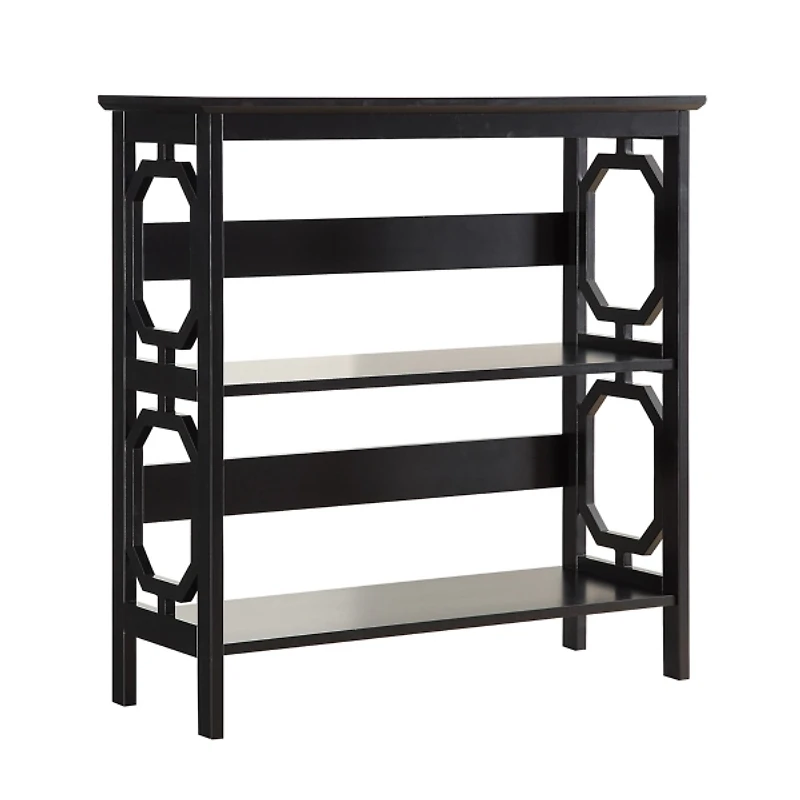 Add a touch of modern charm to your space with this Black Geometric 3-Tier Bookcase! Designed to blend seamlessly into a variety of interiors, this three-tier bookcase offers both style and functionality. Bookcase measures 31.5W x 11.75D x 32.5H in. Crafted of MDF Black finish Features three (3) tiers of shelving Geometric cut-out designs Weight: 26 lbs. Weight capacity: 11 lbs. per shelf Assembly required Not intended for commercial use Care: Wipe with a soft, dry cloth. This item is available at Kirklands.com only, not available in stores. Please note: this item cannot be shipped to APO/FPO addresses.