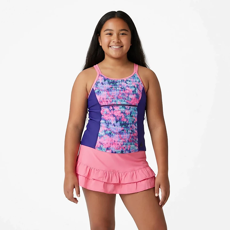 Splash around in the Gerry Girls' Drench Double Strap 1-Piece Ruffle Skirt Swim Set. Its suit and skirt are made of 82% nylon and 18% spandex. The set provides natural, chemical-free UPF 30+ sun protection, and its quick dry fabric eliminates chaffing after water activities. The breathable lining reduces skin irritation.