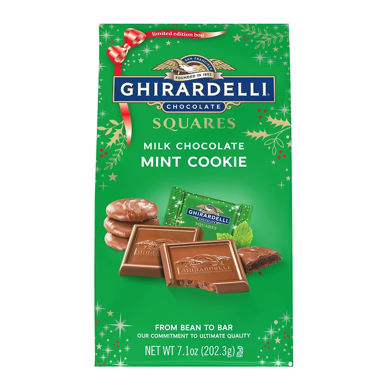 Ghirardelli chocolate squares are made with the highest quality ingredients. The mint chocolate flavor has crunchy chocolate cookie bits, making these treats perfect for Christmas!Details:Mint Cookie limited holiday edition flavor7.1 oz. (202.3 g) net wt.May contain tree nutsContains milk and soyKosher