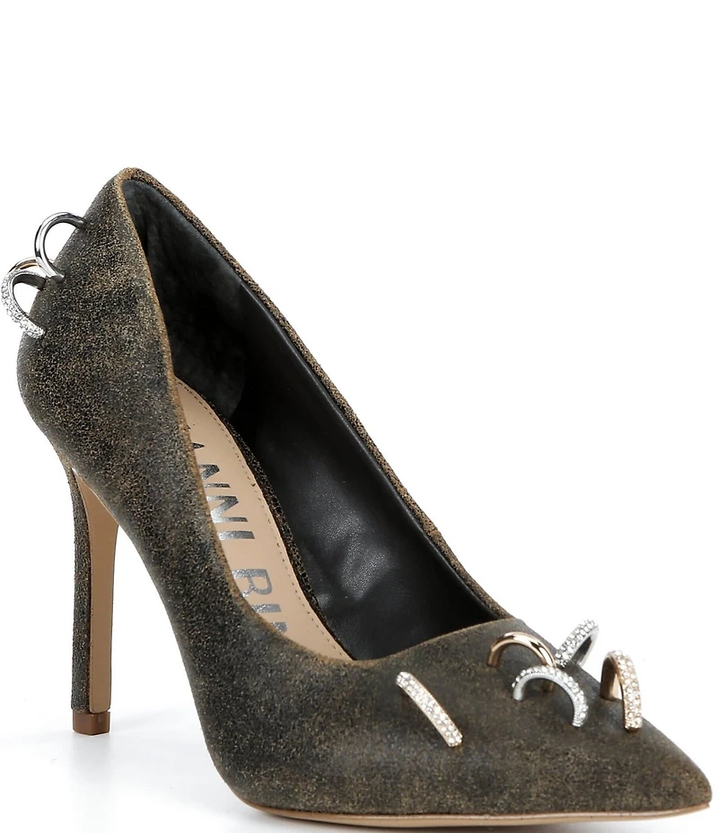 From Gianni Bini, the Shilo Pierced Leather Pointed Toe Pumps feature: Distressed leather upper Rhinestone embellished piercing details Pointed toe construction Slip on design Synthetic lining Suede back counter lining for comfort and breathability Padded 4mm memory foam sock Synthetic outsole Approx. 3.81" heel height Imported.