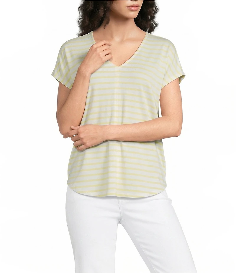 From Gibson & Latimer, this shirt features: Striped pattern Stretch knit fabrication V-neckline Dropped shoulder Short sleeves Pullover construction Center front seam detail Tee silhouette Classic fit High-low shirttail hemline Approx. 25.25" HPS in length Rayon/spandex Machine wash in cold cycle, wash with similar colors and fabrications, tumble dry on low, use cool iron as needed Dillard's Exclusive. Imported.