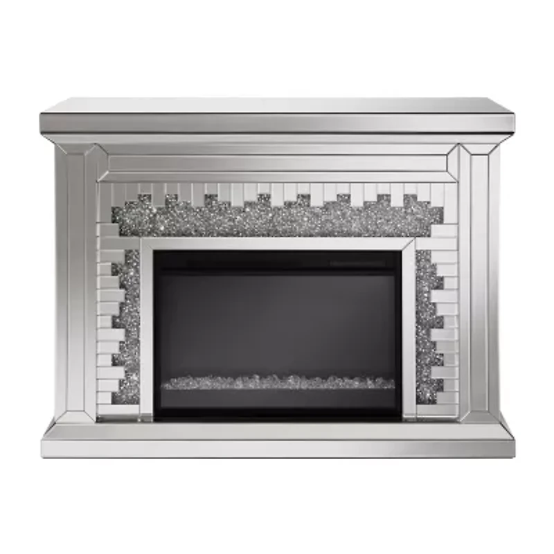Crushed crystal accents glimmer and sparkle in this unforgettably stunning modern fireplace. Wrapped in a beveled mirror trim and tile all over to give a highly polished effect, this freestanding fireplace resembles a traditional style flanked by column-like sides, staggered brick-inspired shapes and even a spacious mantle where you can place candles, books and more. With a convenient remote control, turn this fireplace on from the comfort of a sofa or bed, igniting the glowing ambiance. For a realistic warmth, there is also an optional heating element that can heat rooms of up to 400 square feet. Set this freestanding modern fireplace along the wall for a bold focal point.
