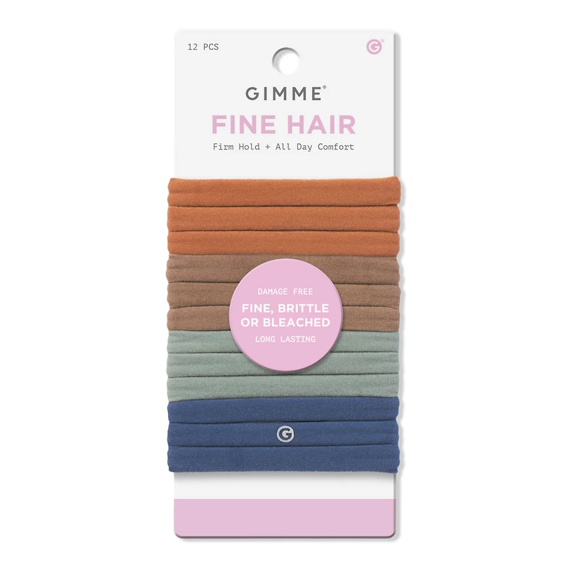 HR BND FN ASRT CLRS PS 12CT. Benefits: These hair bands are gentle on hair, ensuring that you can keep your hair up without any pulling or tension, making them incredibly comfortable to wear. Gimme Beauty Fine Hair Ties are specifically designed to hold thin, delicate hair securely in place.. Perfect for everyday wear, each pack comes with 12 assorted color hair ties, ideal for any occasion. Suitable for both adults and teens, they offer versatile styling options for a wide range of ages and preferences.. Features: Designed For - Fine Fit Hair Bands are made for most hair types recommended for fine, thin, and delicate hair.. All Day Comfort - Our Fine Hair Ties are optimized to secure a firm yet strong hold specifically for your hair as well wrist wearing.. Dent Free - Spreads tension & retains elasticity.. Made Of - Gimme Hair Ties are made from a premium blend of nylon, silk & spandex fiber materials.. No Headaches - Enjoy an all day secure yet gentle hold on your hair. Seamless Design - Enjoy no damage or pulling when removing your hair tie.. :