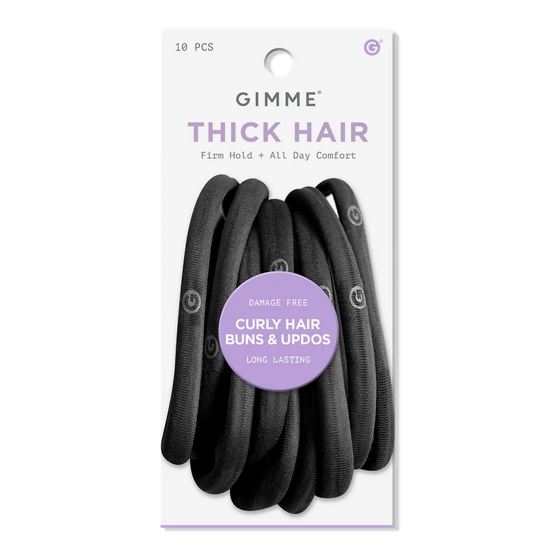 HR BND LNG BLCK/PS 10CT. Benefits: These hair bands are gentle on hair, ensuring that you can keep your hair up without any pulling or tension, making them incredibly comfortable to wear.. Gimme Beauty Long Hair Ties are specifically designed to hold longer, thicker, and curly hair securely in place.. Perfect for everyday wear, each pack comes with 10 black hair ties, ideal for any occasion.. Suitable for both adults and teens, they offer versatile styling options for a wide range of ages and preferences.. Features: Designed For - Long Thick Fit Hair Bands are made for most hair types recommended for thicker, curly, and longer hair.. All Day Comfort - Our Long and Curly Thick Hair Ties are optimized to secure a firm yet strong hold for your hair as well wrist wearing.. Made Of - Gimme Hair Ties are made from a premium blend of nylon, silk & spandex fiber materials.. Dent Free - Spreads tension & retains elasticity.. No Headaches - Enjoy an all day secure yet gentle hold on your hair.. Seamless Design - Enjoy no damage or pulling when removing your hair tie.. Strongest + Longest Hold - Our Thick Fit Bands can withstand up to 70 lbs. of pressure compared to standard elastics that break with an average of 8 lbs. of pressure.. :