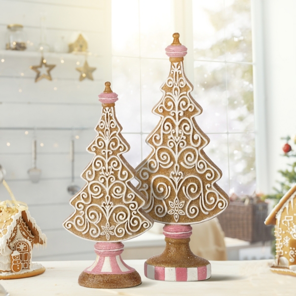Sweeten your holiday season with these Gingerbread Tree Table Decorations! These whimsical gingerbread trees are sure to bring a festive touch to any corner of your home. Set includes two (2) trees Large tree measures 13.5H in. Small tree measures 11H in. Crafted of resin Features a gingerbread tree cookie design with ornate frosting details Accented with pink macaroon toppers and stripped bases Hues of brown, white, and pink Note: Due to the nature of the materials, debris may appear in the packaging or during unpacking and setup. Care: Dust with a soft, dry cloth. This item is available at Kirklands.com only, not available in stores. Please note: this item cannot be shipped to APO/FPO addresses.