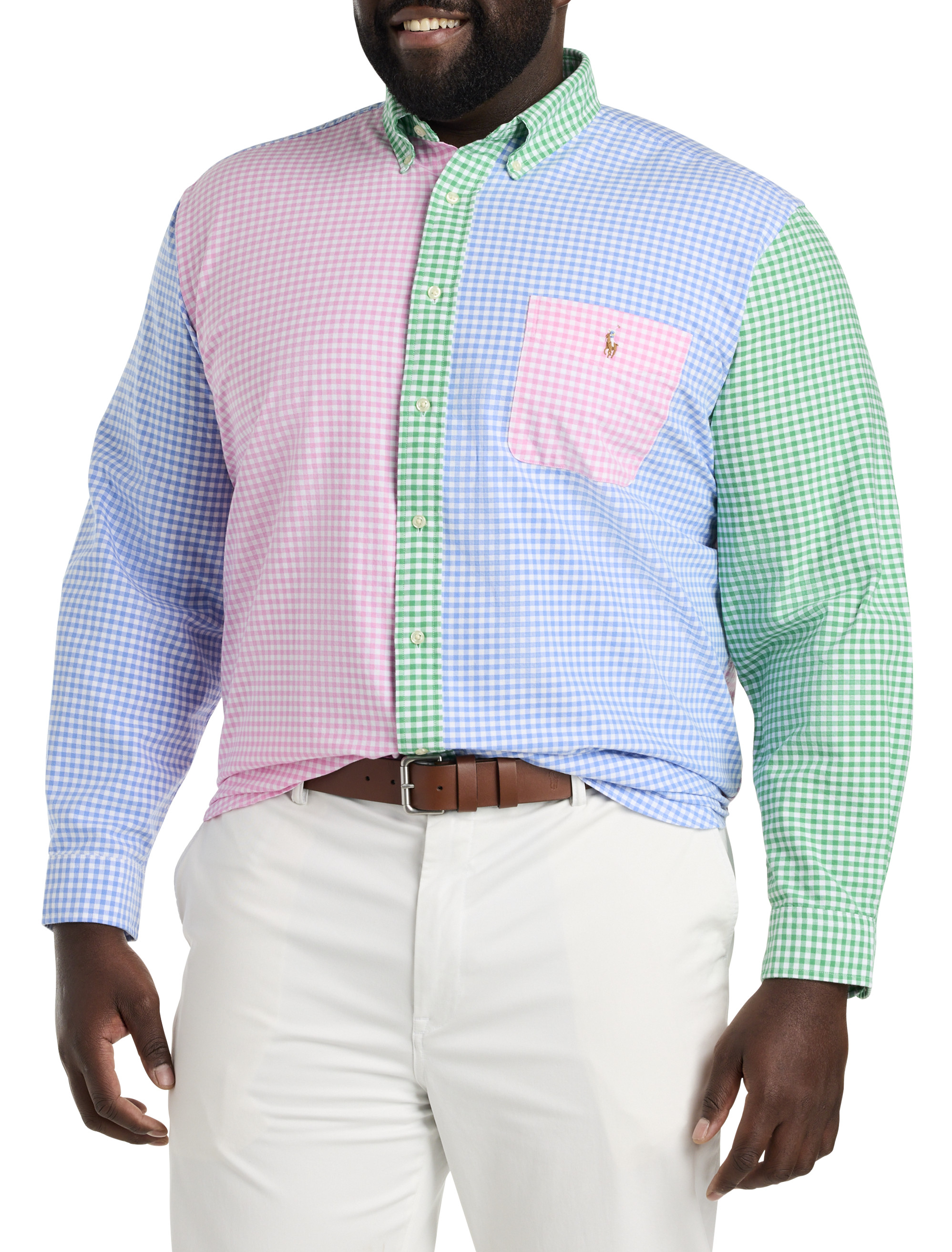 Decades ago, tailors would learn their craft by sewing together shirts made from fabric remnants. Over time, a staple of playful preppy style evolved from the practice, creating a fun look like this one from Polo Ralph Lauren. This version combines three gingham patterns into a single statement-making oxford, adorned with the iconic multicolored Pony.