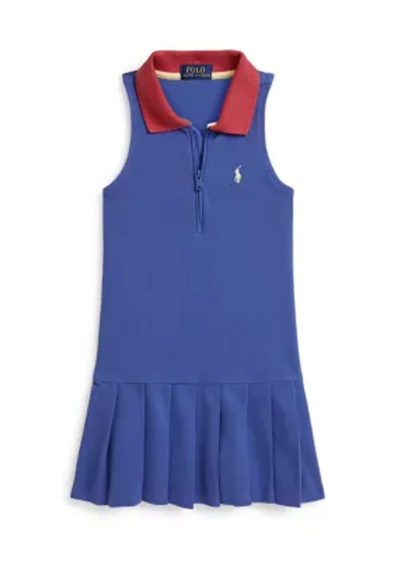 This stretch mesh Polo dress from Ralph Lauren Childrenswear is designed with a drop-waist silhouette, a pleated skirt and a 1/2-zip placket. Their signature embroidered Pony and a contrasting collar add playful pops of color. 98% cotton, 2% elastane Machine washable Drop-waist silhouette Size 4 has a 22" body length (front and back) Signature embroidered Pony at the left chest Ribbed Polo collar 1/4-zip placket Zipper pull custom-developed with a “Polo” logo Pleated skirt Imported Imported