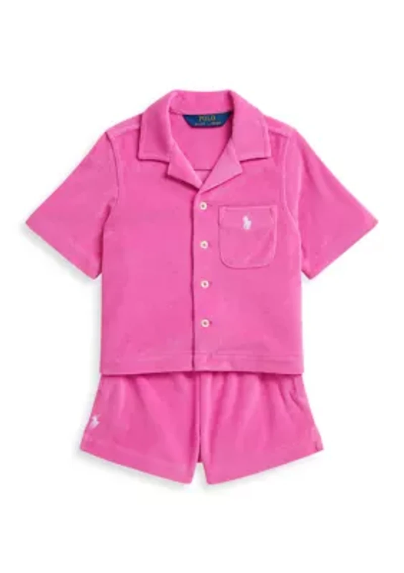 This Ralph Lauren Childrenswear warm-weather set includes a shirt and shorts that are both made with plush cotton-blend terry and embroidered with their signature Pony. Short: signature embroidered Pony at the right hem; elastic drawstring waistband; side on-seam pockets; back right patch pocket Shirt: signature embroidered Pony at the left chest; camp collar; buttoned placket; short sleeves; left chest patch pocket; vented hem Imported Product Specifications Size 4 short has a 7.5" rise and a 2.25" inseam Size 4 shirt has a 13.5" back body length Material & Care 80% cotton, 20% polyester Machine Washable