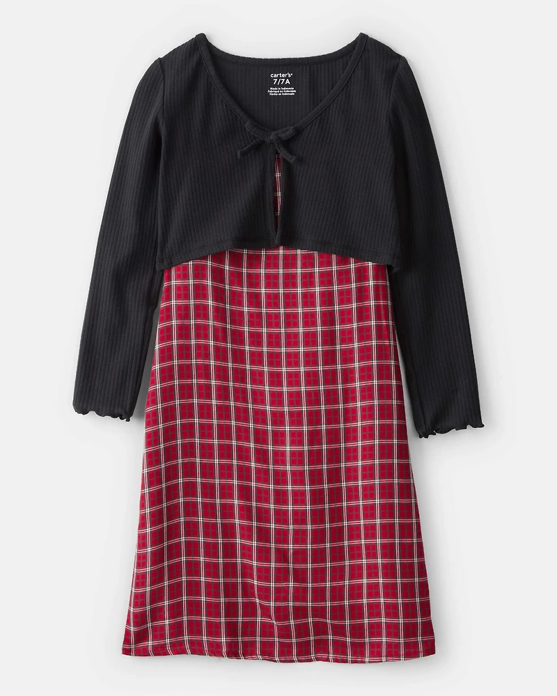 Girls 2-Piece Plaid Long-Sleeve Dress Set - Red