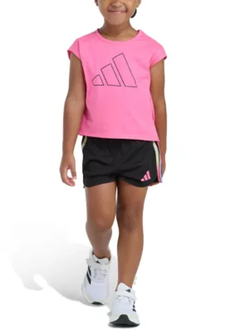 This adorable adidas two-piece set is perfect for active little girls. Crafted from soft, breathable 100% cotton, the crew neck t-shirt features a stylish back pleat detail, while the matching mesh shorts offer comfortable movement with an elastic waistband. 2-piece set Bottom: elastic waistband, mesh Top: crew neck, short sleeves, back pleated Imported Material & Care 100% cotton Machine washable