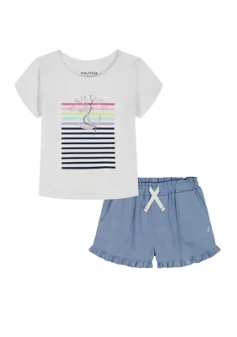 This Kids Headquarters nautical-inspired t-shirt with colorful stripes and anchor detail pairs perfectly with soft denim shorts featuring playful ruffles. Ideal for sunny adventures or relaxed days, this set brings charm and ease to every moment. 2 piece set Tie closure Crew neck Imported Material & Care 100% cotton Machine washable