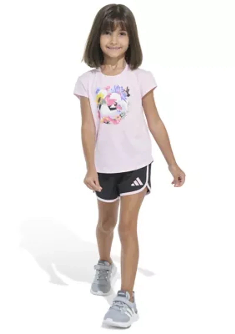 Covered in colorful floral prints for an extra sweet look, this comfy cotton-blend t-shirt from adidas pairs with easy-on shorts for a fun play-ready style. 2-piece set T-Shirt: pullover, crew neck, short sleeves Shorts: elastic waistband Imported Material & Care Cotton, polyester Machine washable