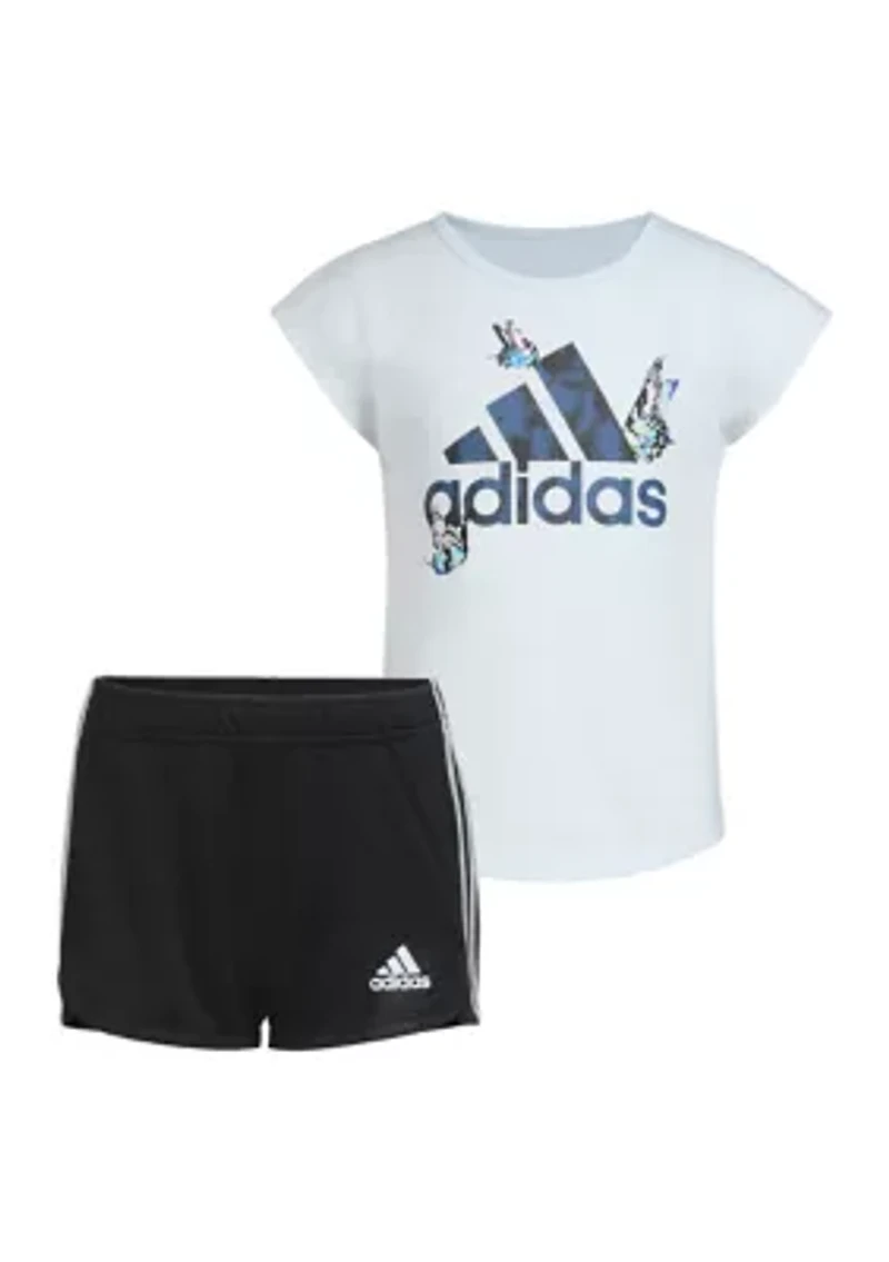 Sporting the adidas logo, this sporty set is a must-have for your active little girl. 2-piece set T-shirt: pullover, round neck, short cap sleeves Shorts: elastic waistband Imported Material & Care Polyester, cotton Machine washable