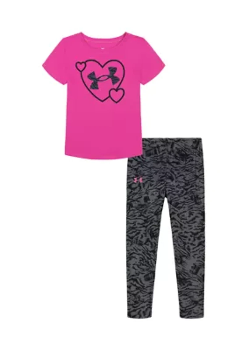 A cute design and bold prints add a lovely touch to this cute set from Under Armour®. Crafted with UA Tech™ fabric and finished with 4-way stretch, this set comes complete with a comfy short-sleeve t-shirt and a pair of printed leggings. 2-piece set T-Shirt: pullover, crew neck, short sleeves Leggings: elastic waistband Imported Material & Care Cotton, polyester Machine washable
