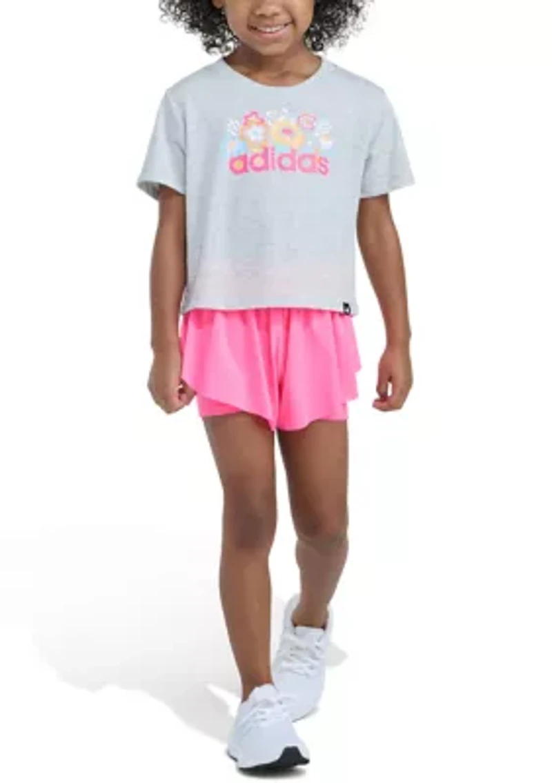 This adorable two-piece shirt-and-short set from adidas is perfect for active little girls, featuring a crew-neck T-shirt and flowy shorts for all-day comfort and easy movement. 2-piece set Elastic waistband Crew neck Imported Material & Care Cotton, polyester Machine washable