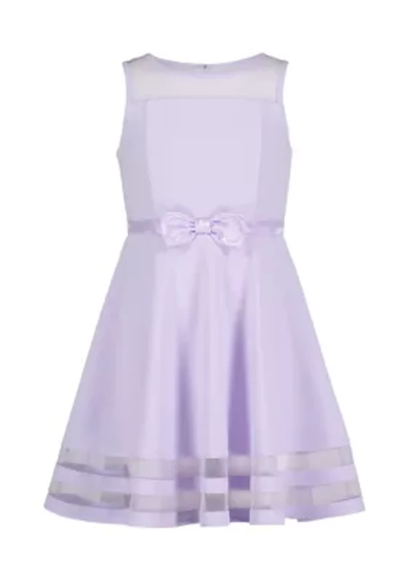Simple, elegant, and comfortable, this dress by Calvin Klein features a sleeveless fit-and-flare silhouette trimmed with mesh. A satin belt cinches the waist while a playful skirt amplifies her twirl power. - Fitted bodice with full skirt and mesh trim along the neck and hem - Comfortable fabric with stretch spandex - Fit and Flare silhouette - The hem of the dress hits above the knee - Back button and zip closure - Boat neck - Ribbon belt with non-functional bow Imported Material & Care Polyester, spandex Machine washable