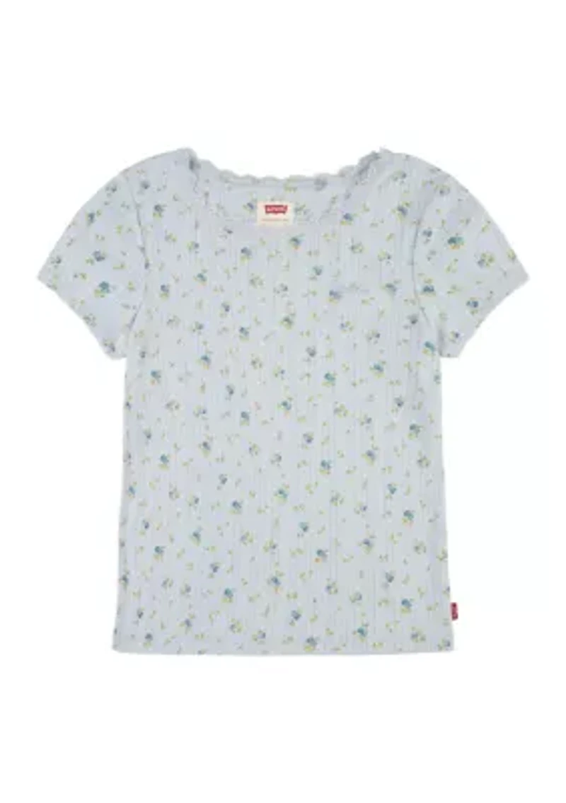 Delicate floral patterns surround the lace eyelets of this charming top from Levi's®. Finished with a classic round neckline and short sleeves, this top will pair well with her favorite jeans for a complete look. Pullover Round neck Short sleeves Imported Material & Care Cotton, polyester Machine washable
