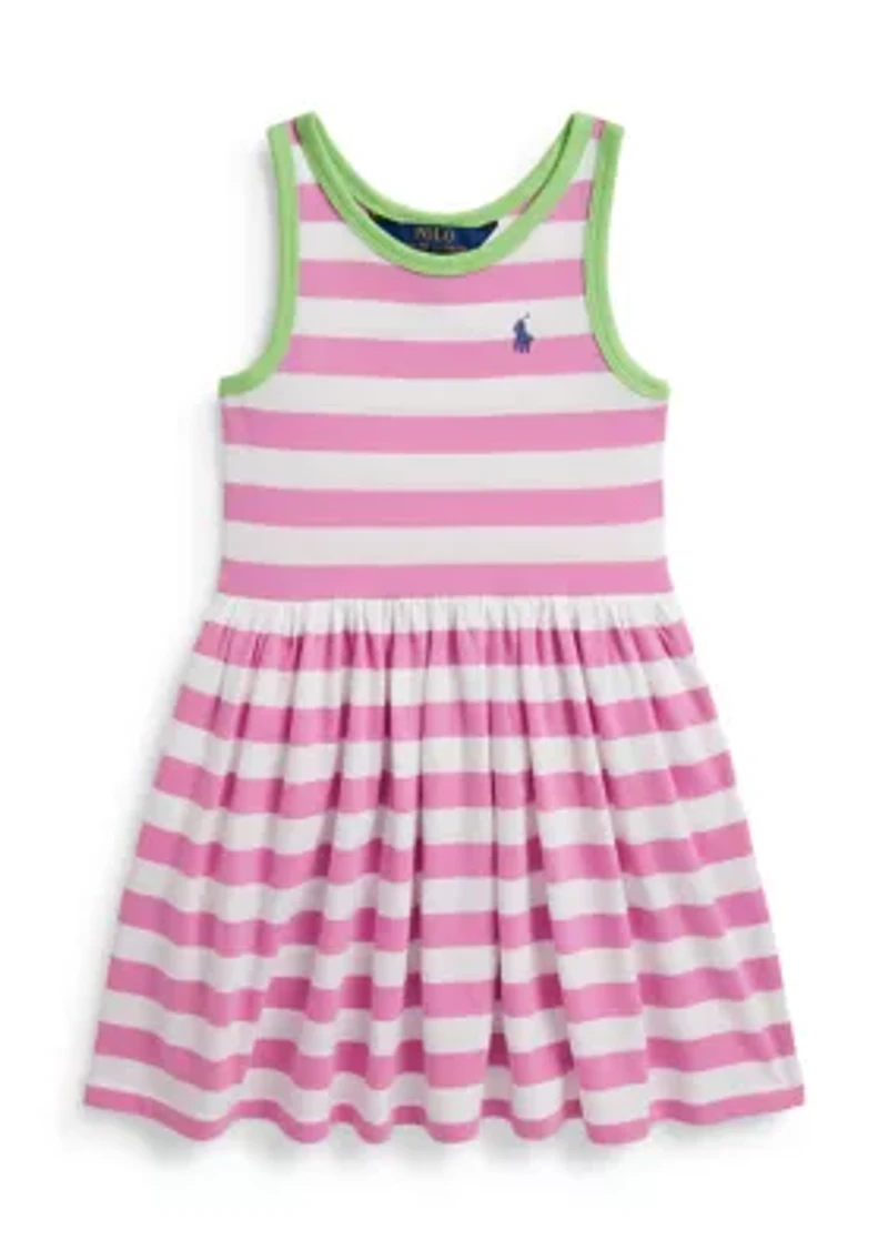 This Ralph Lauren Childrenswear cotton jersey dress is washed for added comfort and detailed with contrasting trim for a playful pop of color. 100% cotton Machine washable Sleeveless fit-and-flare silhouette Size 4 has a 22" body length (front and back) Signature embroidered Pony at the left chest Crewneck Ribbed armholes Shirred waist Side on-seam pockets Imported Imported