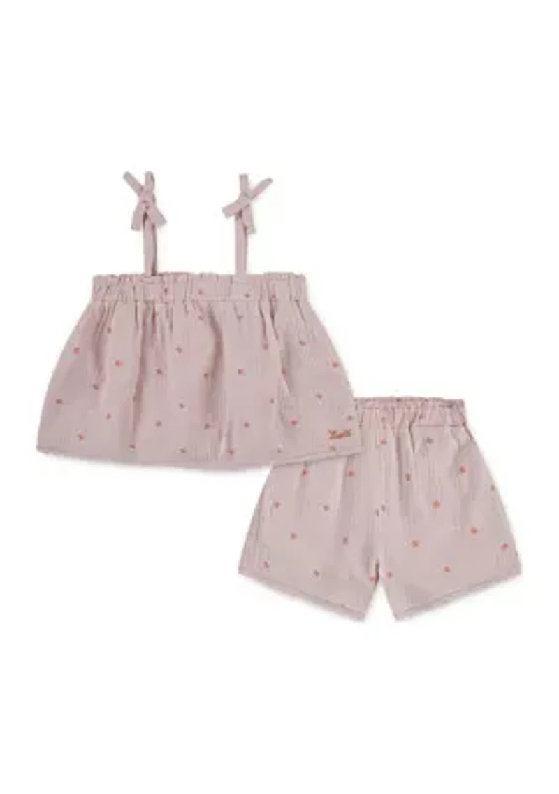 This adorable two-piece set from Levi's® is perfect for your little girl's summer wardrobe. The square-neck tank top and matching elastic waistband shorts are made from a soft and breathable cotton blend, ensuring all-day comfort. The vibrant colors and playful design will make your little one stand out in the crowd. 2-piece set Top: pullover, square neck, sleeveless Shorts: elastic waistband Imported Material & Care Cotton, polyester Machine washable