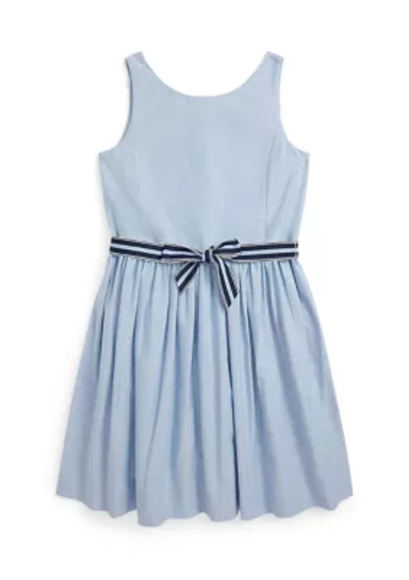 This Ralph Lauren Childrenswear cotton oxford dress is cut for a sleeveless fit-and-flare silhouette and finished with a matching grosgrain sash. By choosing their cotton products, you're supporting their investment in the Better Cotton™ mission to help cotton communities survive and thrive, while protecting and restoring the environment. This product is sourced via a system of mass balance and therefore may not contain Better Cotton™. Visit bettercotton.org/mass balance for more information about mass balance. Imported Material & Care 100% cotton Machine washable