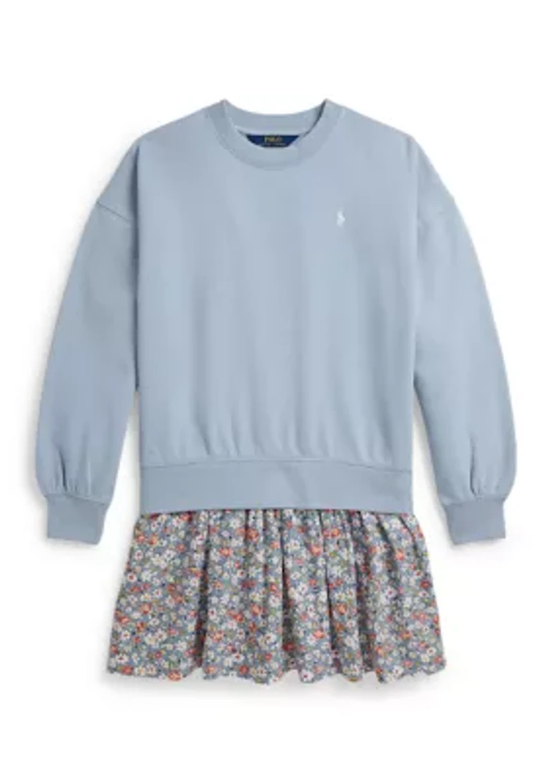 Inspired by New England’s effortless coastal charm, this Ralph Lauren Childrenswear cotton dress combines the comfort of a French terry sweatshirt with a floral-print poplin skirt. Drop-waist silhouette Signature embroidered Pony at the left chest Crew neck Imported Product Specifications Sleeve length is taken from the center back of the neck Size medium has a 28.5" body length (front and back) and a 27" sleeve length Material & Care 100% cotton Machine washable