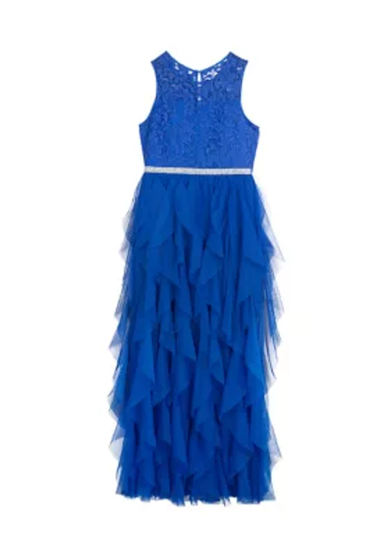 A lace-detailed bodice and cascading chiffon maxi skirt make this dress from Rare Editions a pretty pick for your little princess. Zip closure Round neck Imported Material & Care Nylon, spandex Hand wash