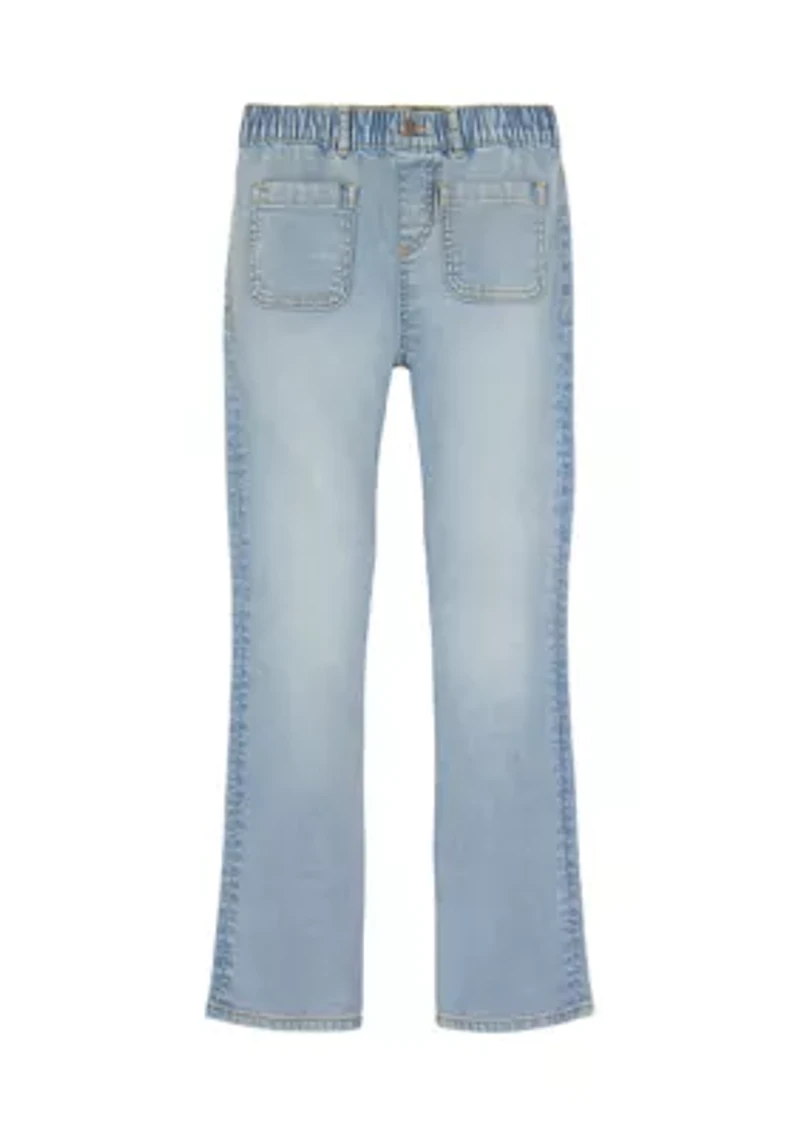 Super simple and extra cute, these denim jeans from Lucky Brand are perfect for pairing with her favorite t-shirt. Button closure, elastic waistband, zip closure Belt loops 2 front patch pockets, 2 back patch pockets Straight fit Flared leg Imported Product Specifications Ankle length Material & Care Cotton, polyester, spandex Machine washable