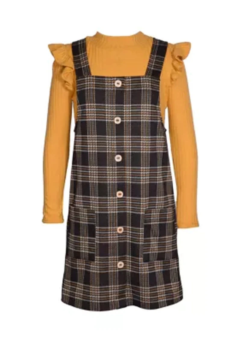 This cute plaid-printed dress set from Bonnie Jean is perfect for her to wear to school or to small gatherings. 2-piece set Jumper: button closure, square neck, sleeveless Dress: pullover, mock neck, long sleeves with ruffle shoulders Imported Material & Care Cotton, polyester, spandex Machine washable