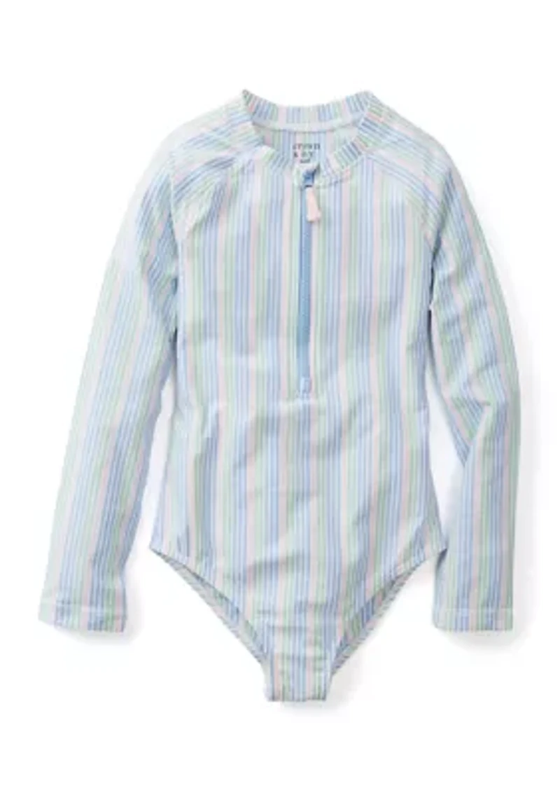 This rash guard is a must-have for active girls who love water adventures. Made from durable material, it provides excellent protection from the sun's harmful rays, allowing your child to enjoy outdoor activities without worry. The zip closure ensures a secure and comfortable fit, while the vibrant colors and stylish design make it a fashionable choice. Perfect for beach days, pool parties, or any water-based activity, this rash guard is a versatile addition to your child's swimwear collection. Zip closure Round neck Long sleeves Imported Belk Exclusive Material & Care Polyester, nylon Machine washable